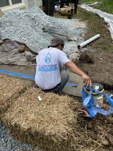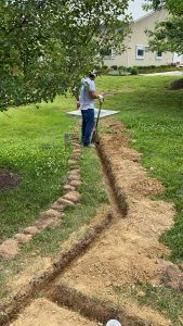 Now the fun begins: We will deliver materials, i.e., drains, drain pipe, stone, and concrete. The first shovel goes into the ground, and you are well on your way to properly managing the water in your yard!